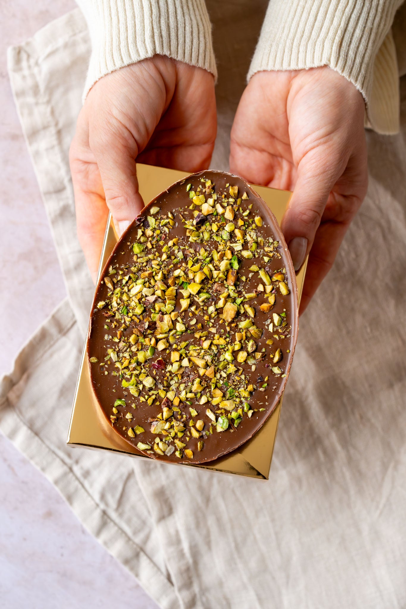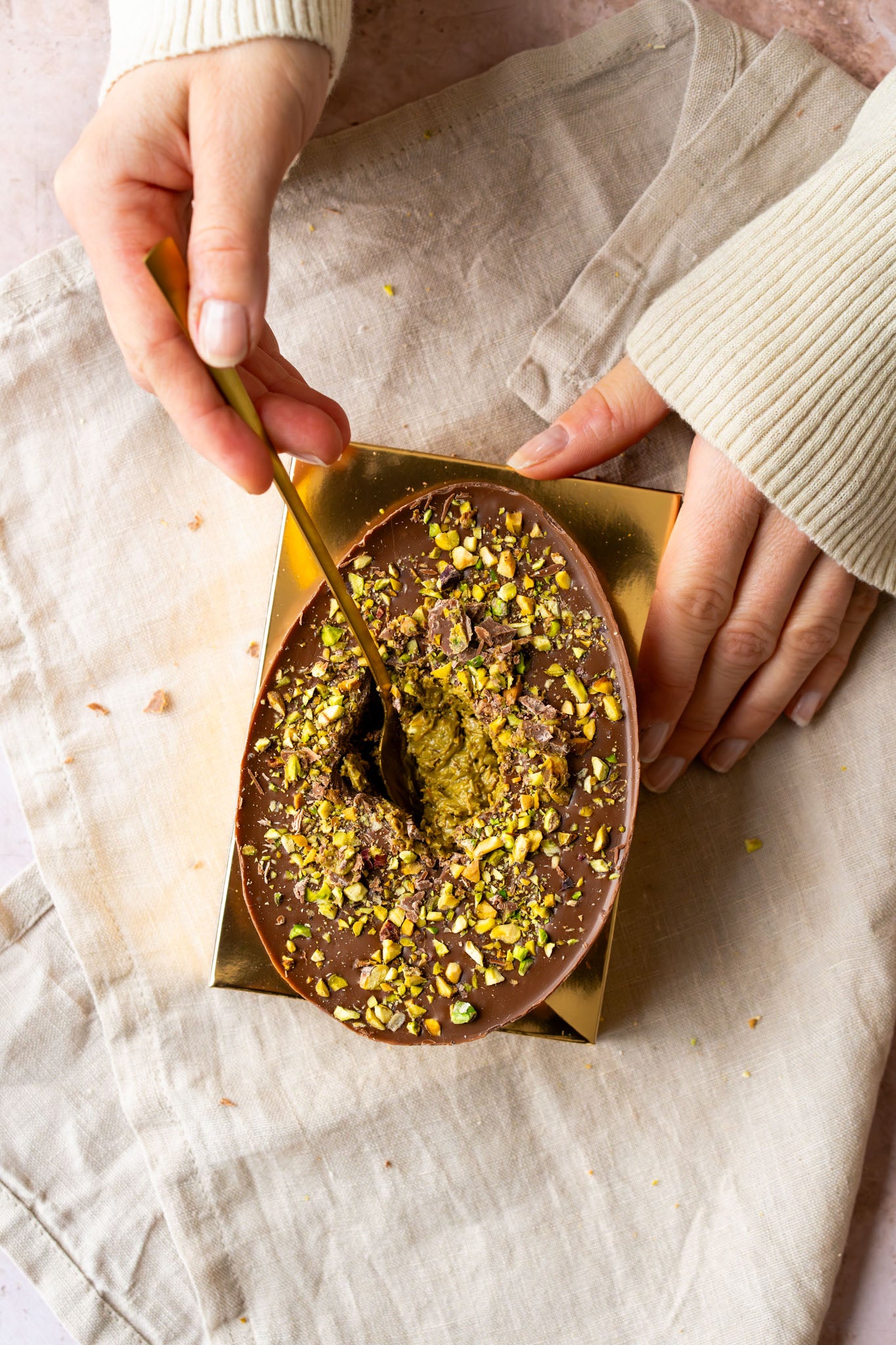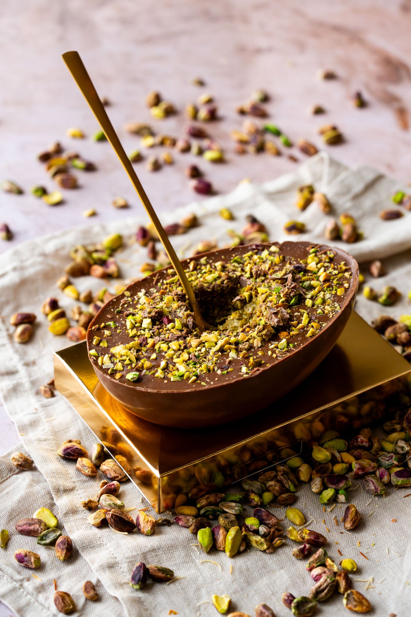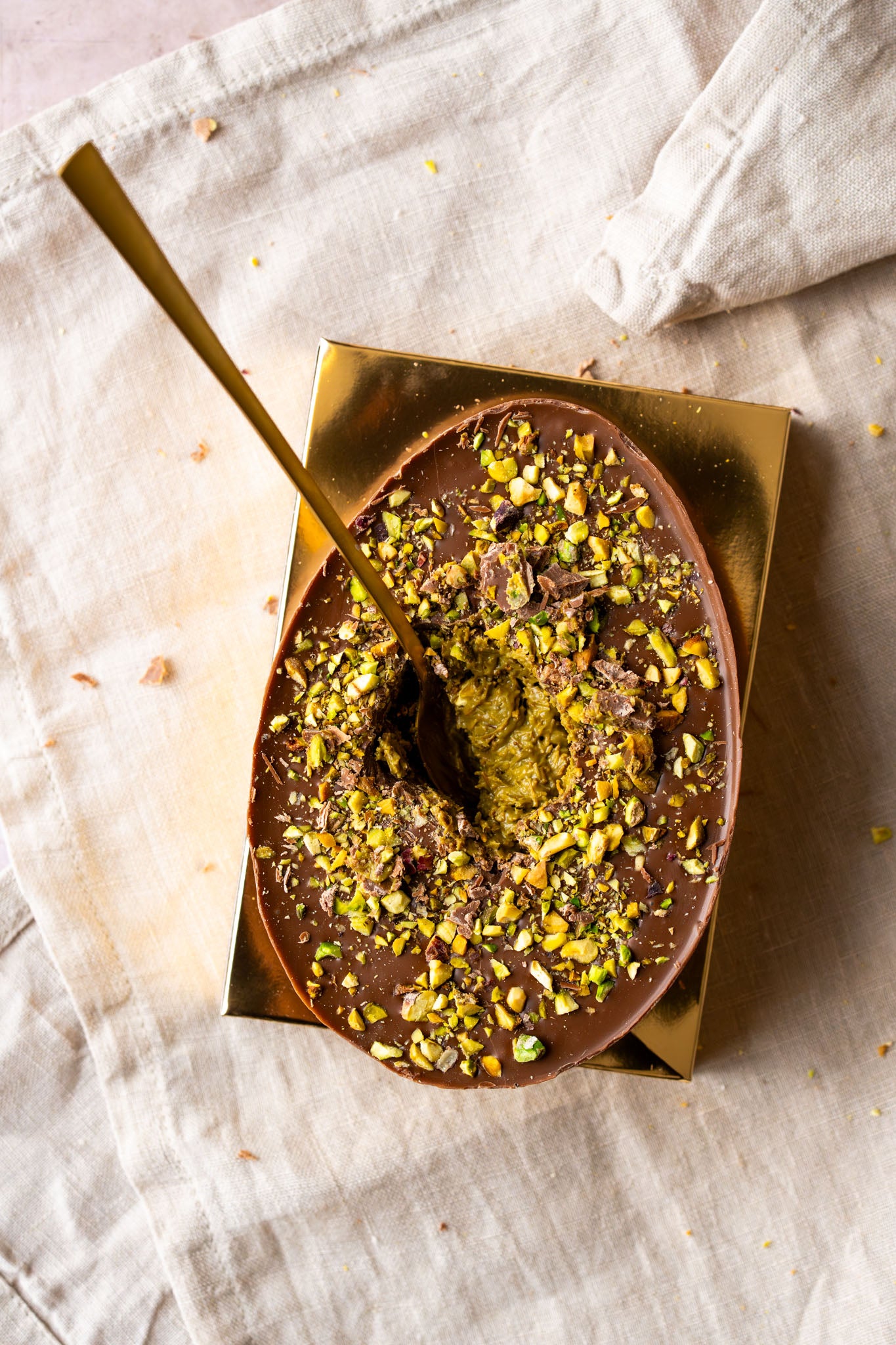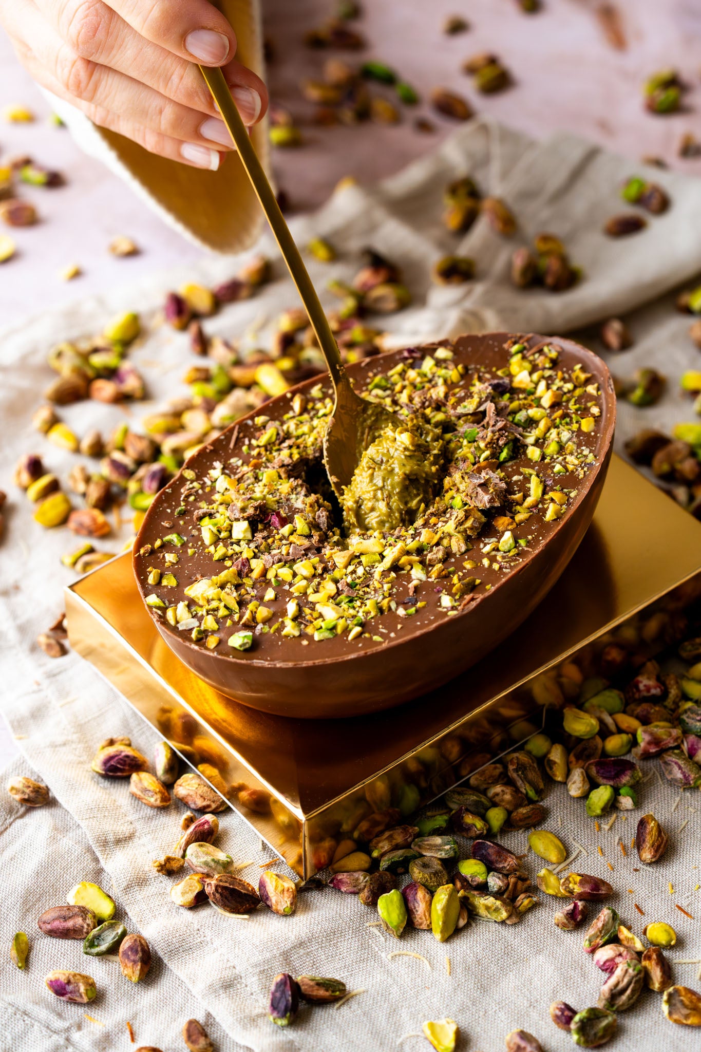 Ben jij ook zo gek op onze pistache kadayif vulling? Dan is dit Paasei écht voor jouw! 400 gram aan pistache chocolade. Een half Paasei he-le-maal gevuld met pistache kadayif vulling, om door te snijden of.... om uit te lepelen!